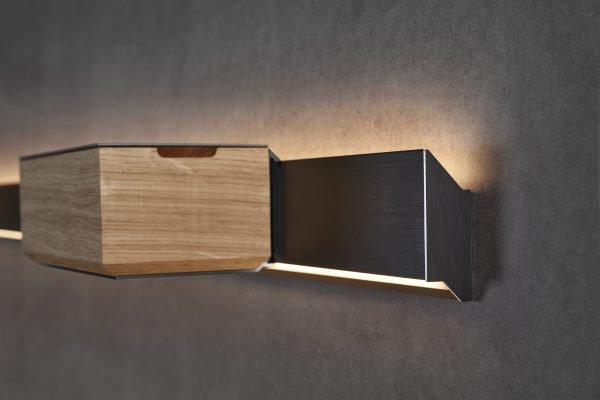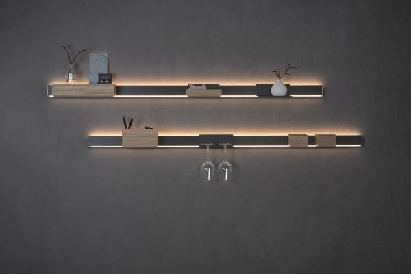 Im Handumdrehen eingeclipst lassen sich die wertigen Holzboxen nach Herzenslust platzieren, stapeln und verschieben. Dabei bleiben sie aufgrund des Designs jederzeit auf Linie, denn das Herunterhängen der Elemente im Sinne des Hosenträgereffekts wurde bewusst vermieden. Als außergewöhnliche Wandillumination strahlt Aton seine Klasse in zwei Richtungen aus. Oberhalb der Reling bringt Aton emotionales Ambiente in den Raum. Unterhalb können Arbeitsfläche, Schreibtisch, Sideboard und andere Objekte wahlweise in funktionales oder emotionales Licht getaucht werden. Das obere und untere Lichtband sind separat regulierbar. Mit Vielseitigkeit und puristischer Ästhetik auf ganzer Linie erweitert Aton den Horizont moderner Wohnkonzepte.